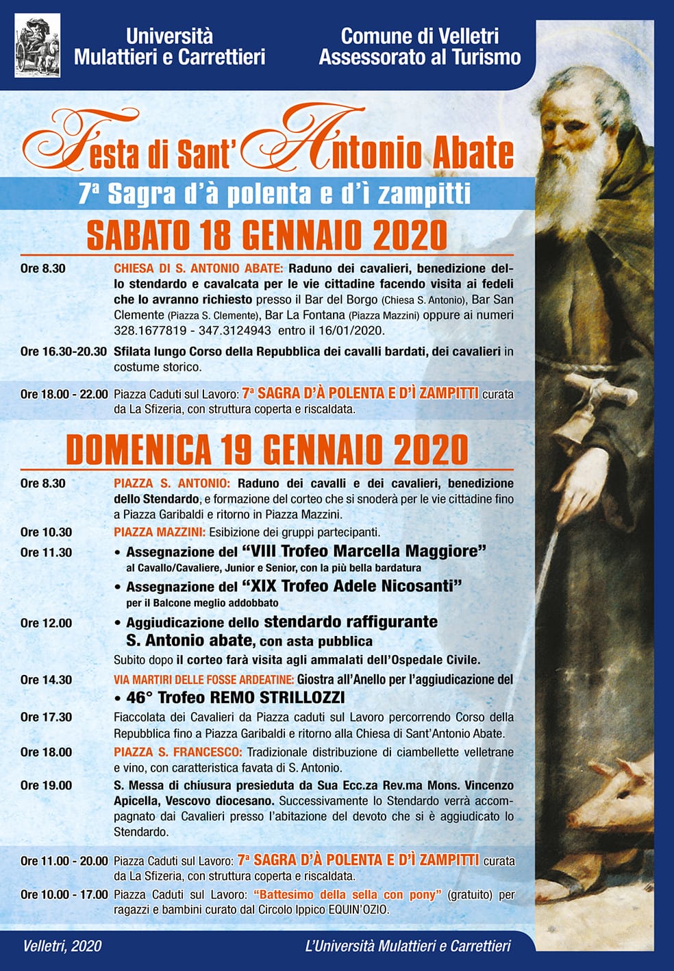 Festa di Sant’Antonio Abate a Velletri. L’evento come ogni anno è organizzato dall’Università Mulattieri e Carrettieri con la collaborazione dell’assessorato al Turismo del Comune di Velletri. L’appuntamento è per questo fine settimana, oggi (sabato 18 gennaio) e domani (domenica 19 gennaio). Nell’ambito della festa ci sarà anche la settima Sagra d’à polenta e d’ì zampitti.