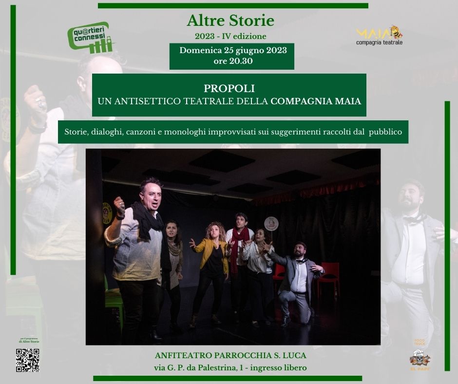Domenica 25 giugno alle ore 20,30 è la volta di “Propoli” un antisettico teatrale della Compagnia Maia. Storie, dialoghi, canzoni e monologhi improvvisati sui suggerimenti raccolti dal pubblico; alle 21,30 a conclusione della rassegna nell’anfiteatro San Luca, il concerto dei Mediterranima, melodie e ritmi del flamenco e del gipsy jazz.
