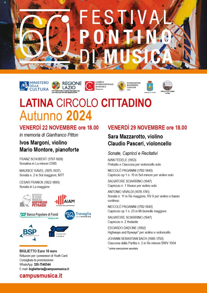 Tornano i concerti del Campus Internazionale di Musica al “Circolo Cittadino” di Latina. Con un’appendice autunnale si conclude il 60° Festival Pontino - che tradizionalmente si tiene a luglio - con due concerti: domani e venerdì 29 novembre, alle 18.00. Domani sera si parte con ilviolinista Ivos Margoni ed il pianista Mario Montore. Il 29 novembre sarà la volta della violinista Sara Mazzarotto e del violoncellista Claudio Pasceri.