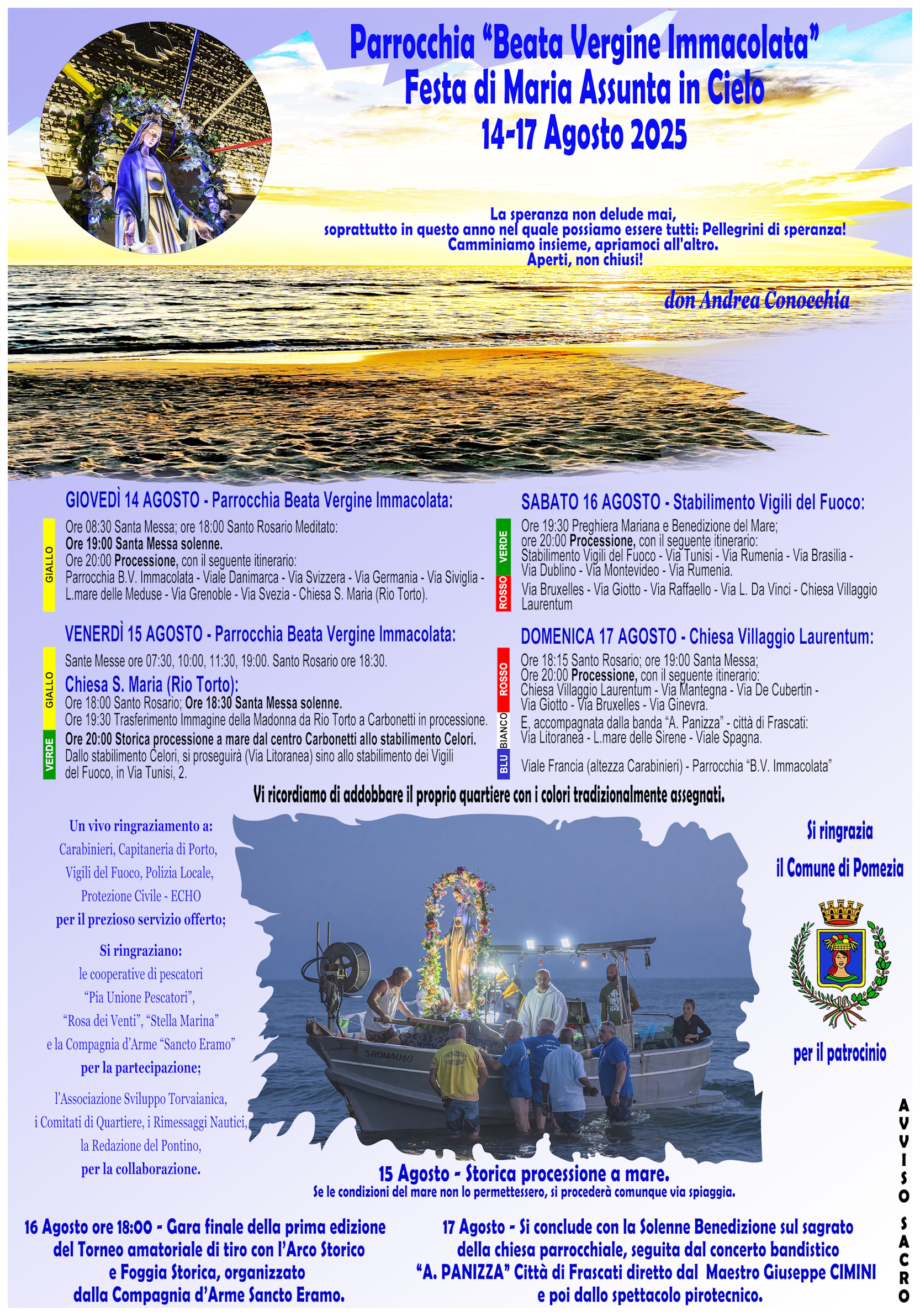 “Come ogni anno arriva puntuale la nostra celebrazione della grande solennità dell'Assunta. - commenta il parroco, don Andrea Conocchia - È un appuntamento importante e significativo che ci vede insieme in parrocchia, sulle strade, sulla spiaggia - tempo e mare permettendo, sulla barca - tra le case, ma anche in tutti quegli ambiti e quegli ambienti di vita che caratterizzano la nostra Torvaianica nel periodo estivo.