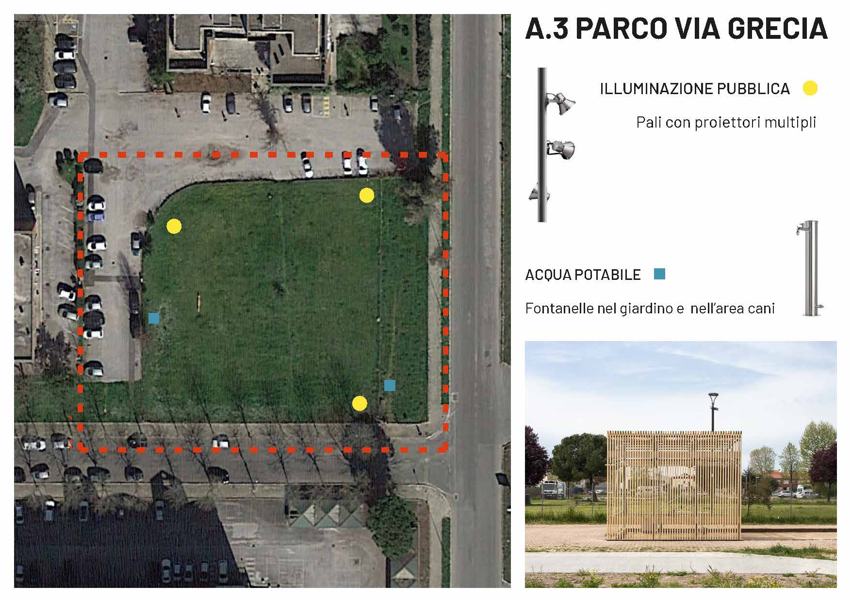 Il Parco di via Grecia sarà uno spazio più sicuro e fruibile, grazie al nuovo impianto di illuminazione e due nuove fontanelle. All’interno di quest’area andremo a realizzare un laboratorio di costruzione con gli abitanti, riadattando le tettoie ad oggi in uso nel parco Francia;