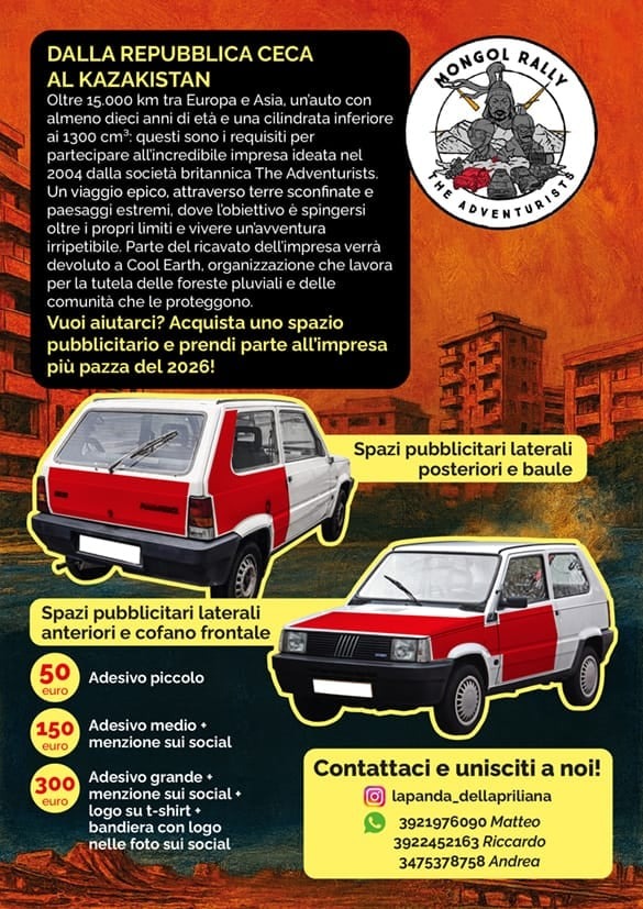 Tre giovani di Aprilia, a bordo di una Fiat Panda Young 1100, affronteranno il “Mongol Rally 2026”, un evento automobilistico non competitivo e benefico che si svolge ogni anno, con l'obiettivo di attraversare oltre 15mila Km tra Europa ed Asia, dalla Repubblica Ceca al Kazakistan. Il gruppo in partenza si fa chiamare “La Panda dell’Apriliana” ed è formato da Riccardo Torosani, Andrea Righi e Matteo Manzini. Per sostenere le spese del viaggio è stata avviata anche una raccolta fondi su Gofundme.com. L'essenza del Mongol Rally - che si svolgerà a metà luglio 2026 - è l'avventura, l'improvvisazione e il supporto a cause umanitarie. Parte del ricavato dell'impresa, infatti, verrà devoluto a Cool Earth, organizzazione che lavora per la tutela delle foreste pluviali e delle comunità che le proteggono.