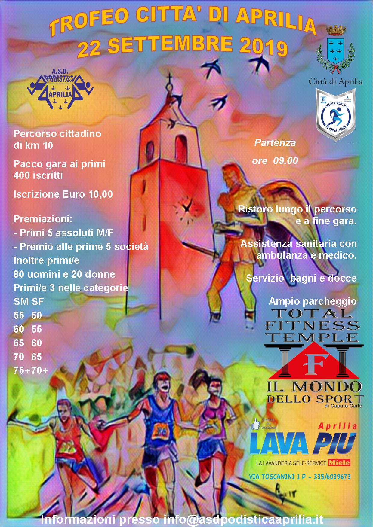 Tutto pronto per il Trofeo Città di Aprilia, la gara podistica che si svolgerà il 22 settembre prossimo. Si tratta di un percorso cittadino da 10 km. La partenza è fissata alle 9 del mattino da via Bardi. L’iscrizione è di 10 euro. Il pacco gara è riservato ai primi 400 iscritti. Previsto ristoro lungo il percorso e all’arrivo. Bagni, docce e ampio parcheggio.