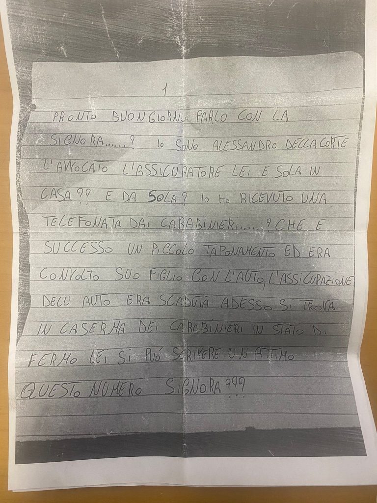 Durante le complesse indagini, volte a disarticolare questo gruppo, i cui componenti sono tutti di origine campana, sono emerse numerose truffe collocate nel periodo compreso tra gennaio e luglio dello scorso anno, oltre a rapine ed estorsioni nei confronti di persone anziane, tutte realizzate con il classico modus operandi del “finto nipote” o di parenti in difficoltà economica; un soggetto effettuava la chiamata all’anziana vittima, prospettando un imminente pericolo per il familiare, evitabile solo con il pagamento di una somma di denaro o con la consegna di preziosi, a quel punto, carpita la fiducia del malcapitato, si presentava sull’uscio di casa un complice, pronto a riscuotere quanto richiesto al telefono; gli indagati si spacciavano anche per direttori di uffici postali, corrieri e/o amici dei congiunti ai quali consegnare denaro o gioielli.