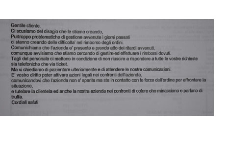 Strategicamente per alimentare il più possibile l’attività truffaldina la società prima di dissolversi on line, ha continuato ad inviare ai clienti note formali, da un lato prendendo tempo e cercando di giustificare gli inadempimenti con un surplus di richieste, dall’altro diffidando tramite un fantomatico ufficio legale dal denunciare la truffa subita arrivando ad asserire di” essere in contatto con le forze dell’ordine per affrontare la situazione .”