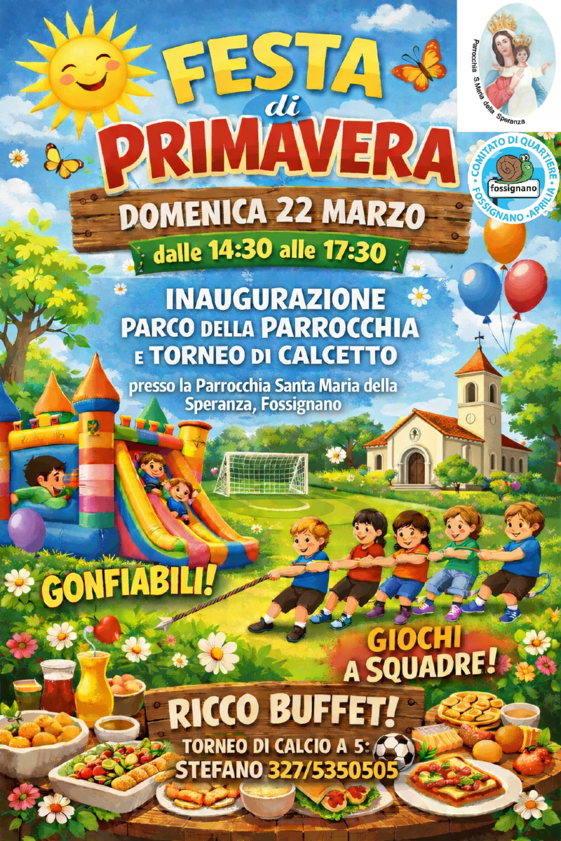 Un evento per inaugurare la ristrutturazione del Parco della Parrocchia e dare la possibilità a famiglie e bambini di passare un pomeriggio insieme per festeggiare la primavera e condividere un meraviglioso pomeriggio insieme. Torneo di calcio a 5, giochi a squadre, gonfiabili e un ricco buffet vi aspettano. Chi vuole potrà anche venire in bicicletta per fare una passeggiata a l'aria aperta godendo delle nostre splendide campagne.