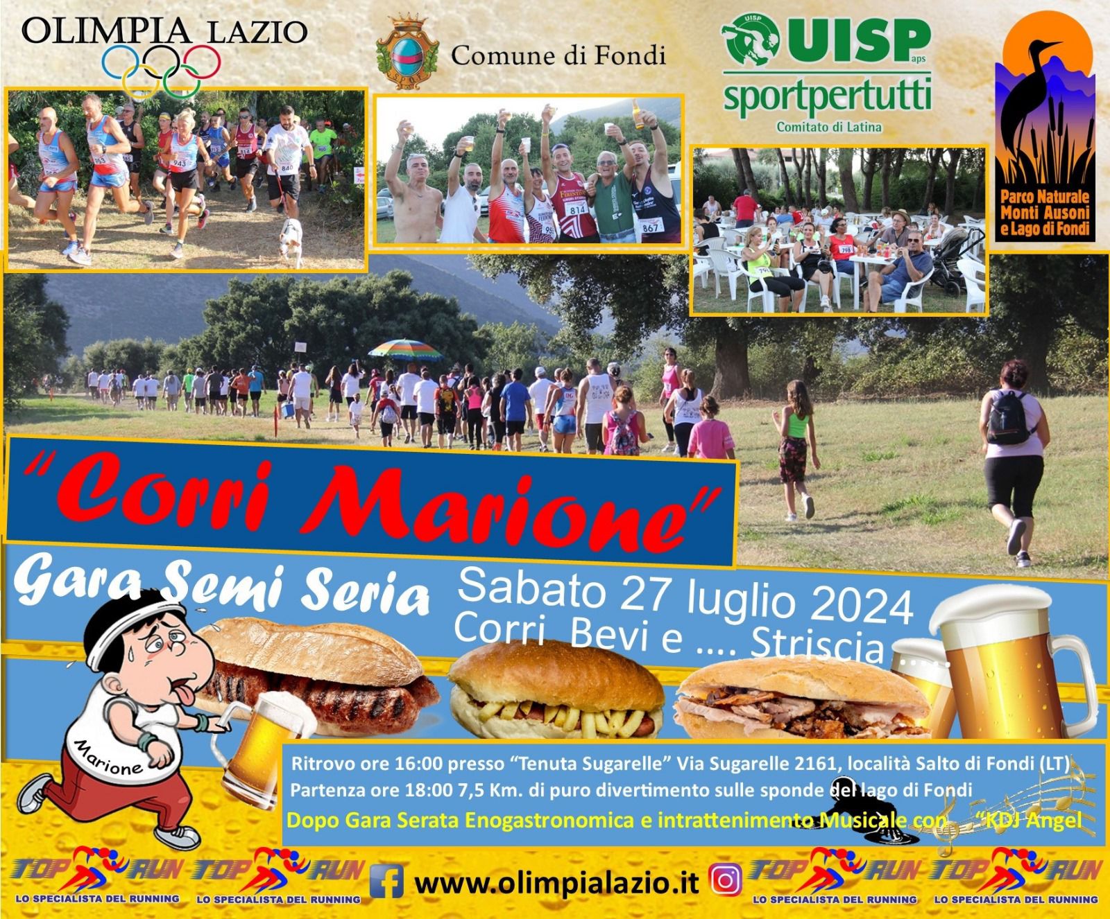 Questo fine settimana a Fondi la quarta edizione del “Corri Marione”, il più divertente evento del Grande Slam Uisp “Natalino Nocera”. La gara goliardica non competitiva tra natura, sorrisi e tanta birra, organizzata dall’Olimpia Lazio, è in programma per questo sabato 27 luglio al Salto di Fondi, in via Sugarelle. Lo start è fissato alle 18.00. In ognuno dei tre ristori allestiti dagli organizzatori ogni partecipante - da regolamento - dovrà consumare un boccale di birra.
