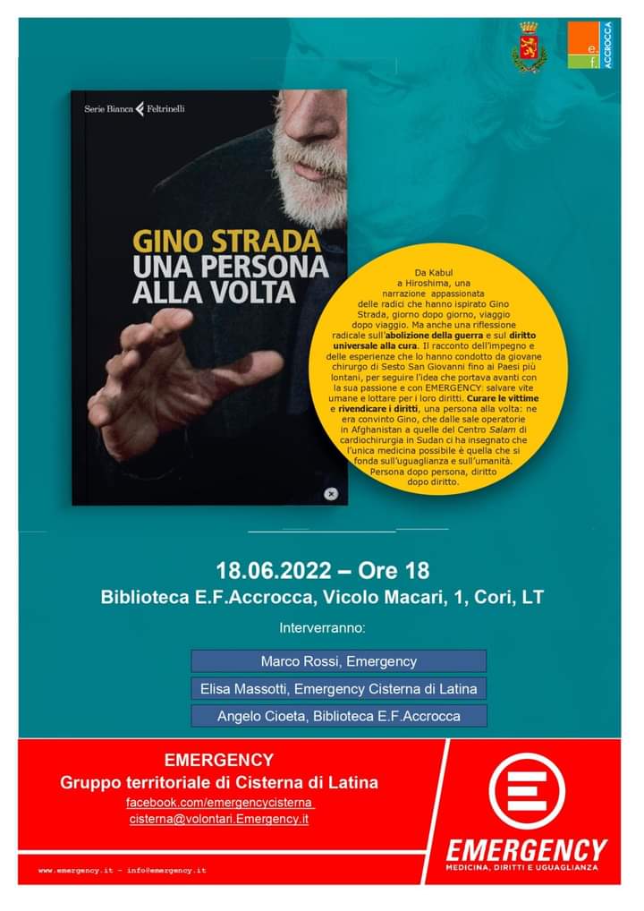 “Una persona alla volta”: questo sabato a Cori la presentazione dell’ultimo libro del fondatore di Emergency, Gino Strada. L’appuntamento è alle 18.00 presso la Biblioteca Elio Filippo Accrocca. Il libro sarà presentato da Marco Rossi di Emergency.