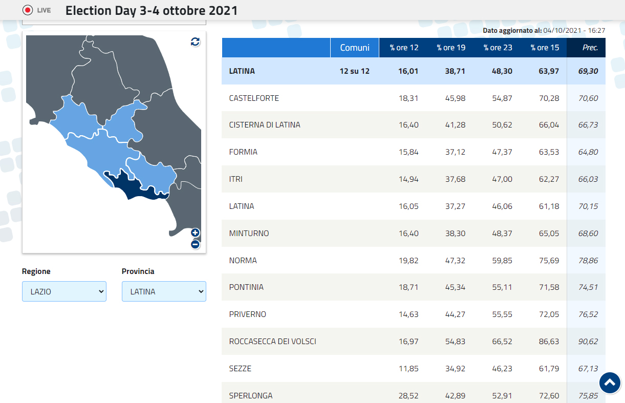 Si chiudono le urne anche nelle province di Latina e Roma, nei Comuni dove si è andati al voto per scegliere il candidato sindaco. Nella provincia pontina su 8 comuni dei 12 al voto, l’affluenza ufficiale dopo la chiusura delle urne è al 66%, oltre due punti percentuali in meno delle precedenti elezioni. Più bassa l’affluenza in provincia di Roma che si è attestata al 62,8%, mentre alle precedenti elezioni fu al 69%. A Frascati ha votato il 55,4% degli aventi diritto, a Marino il 55%. Il dato finale di Roma non è ancora pervenuto. Nella capitale i primi exit poll indicano il ballottaggio tra il candidato di centrodestra Enrico Michetti e quello di centrosinistra Roberto Gualtieri. Fuori – in base alle prime proiezioni – la sindaca Virginia Raggi.