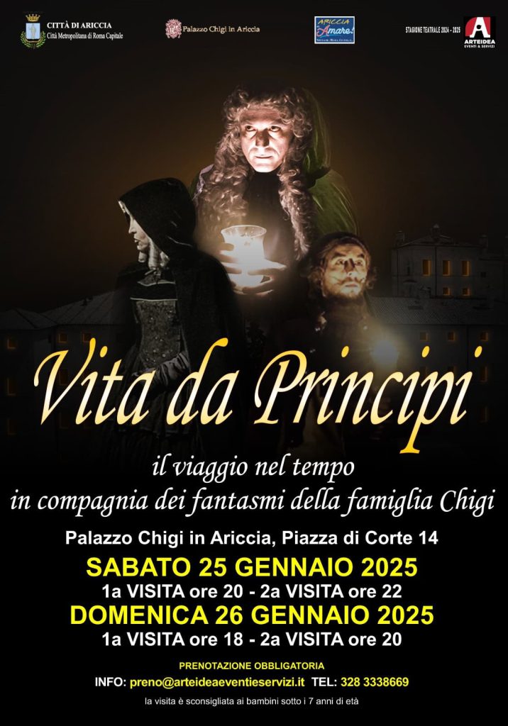 Sabato 25 (alle 20.00 e alle 22.00) e domenica 26 gennaio (alle 18.00 e alle 20.00) andrà, invece, in scena, lo spettacolo “Vita da Principi” in compagnia dei fantasmi di Palazzo Chigi.
