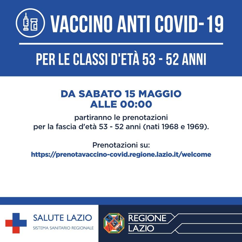 “Dalla mezzanotte di venerdì 14 maggio sarà attiva la prenotazione sul portale salutelazio.it per la fascia di età 52 e 53 anni (ovvero i nati nel 1968 e 1969).”