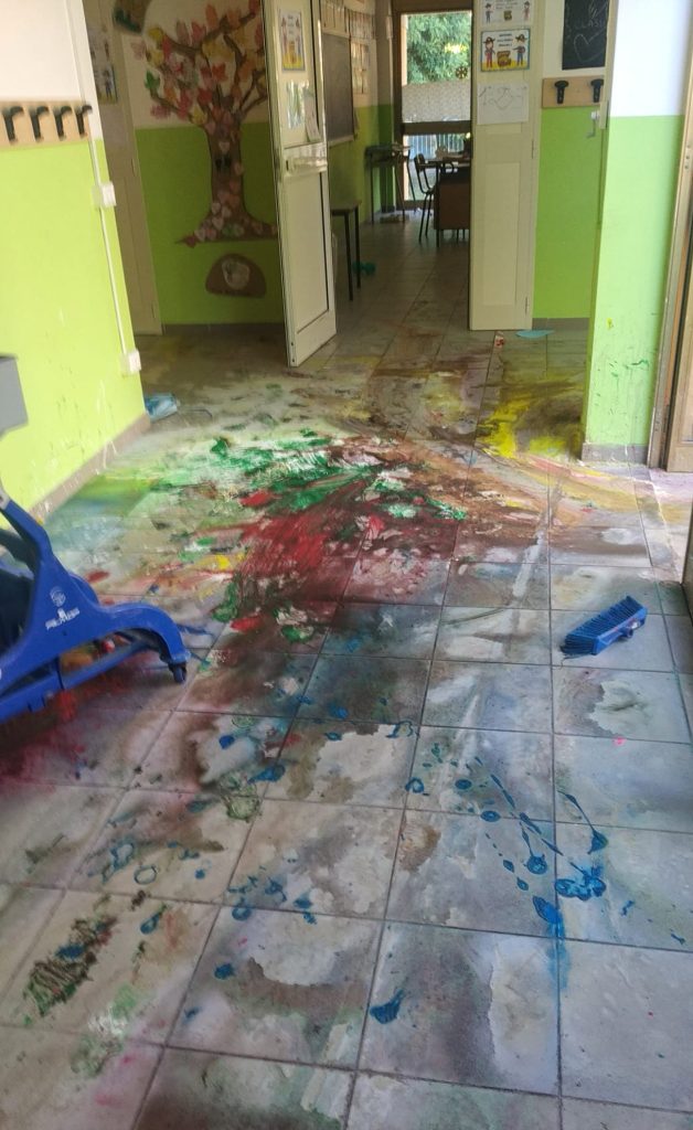 Una volta dentro hanno rovesciato sedie, banchi e soprattutto hanno imbrattato i locali con i colori cospargendo sul pavimento e schizzando sulle pareti.