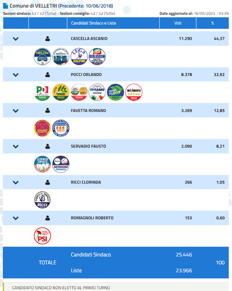 Si va al ballottaggio a Velletri: si sfideranno ancora tra due settimane Ascanio Cascella candidato del centrodestra ( con il 44,3% di voti e in vantaggio di oltre 12 punti percentuali) ed il sindaco uscente Orlando Pocci del centrosinistra, che ha ottenuto il 32,9% di preferenze.