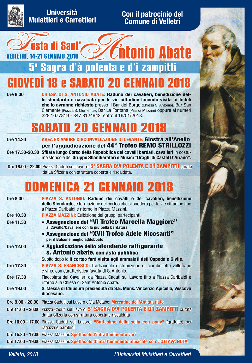 Fino a questa domenica 21 gennaio a Velletri si svolgono la tradizionale festa di Sant’Antonio Abate e la quinta edizione della “Sagra d’à Polenta e d’i Zampitti”. L’organizzazione è a cura dell’Università dei Mulattieri e Carrettieri di Velletri.