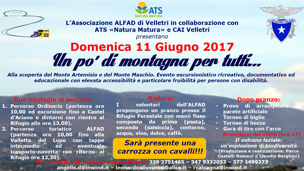 “Un po’ di montagna per tutti”: alla scoperta del Monte Artemisio e del Monte Maschio, a Velletri. Un’escursione è stata organizzata per questa domenica 11 giugno dall’associazione Alfad in collaborazione con “Natura Matura ed il Cai di Velletri. Si tratta di un evento escursionistico ricreativo, fruibile anche per le persone con disabilità. Info e prenotazioni al 339/27.51.465.