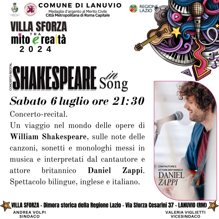 A seguire andrà in scena il concerto recital “Shakespeare in Song”, un viaggio di circa 70 minuti nel mondo delle opere di William Shakespeare, sulle note delle canzoni, sonetti e monologhi messi in musica e interpretati da Daniel Zappi, cantautore e autore britannico.