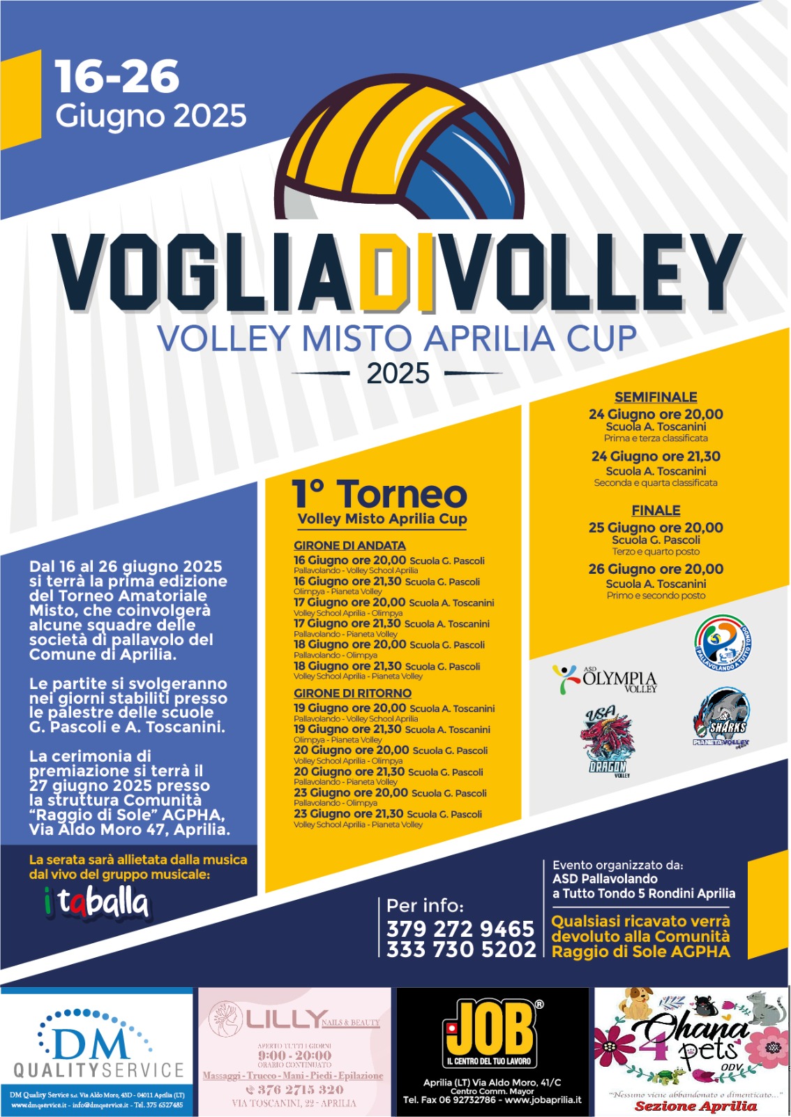 “VogliaDiVolley”, Ad Aprilia il primo “Torneo Amatoriale Misto di Pallavolo”. Ad organizzarlo, dal 16 al 26 giugno prossimi, la Società ASD Pallavolando a Tutto Tondo. L’evento vedrà coinvolte alcune squadre delle principali società di pallavolo della città di Aprilia. Le partite si giocheranno presso le palestre delle scuole “Pascoli” e “Toscanini”. La cerimonia di premiazione si terrà il 27 giugno, a partire dalle 20.00, presso la Comunità “Raggio di Sole”, in via Aldo Moro. Tutti i ricavi economici andranno in beneficienza all’associazione Agpha.