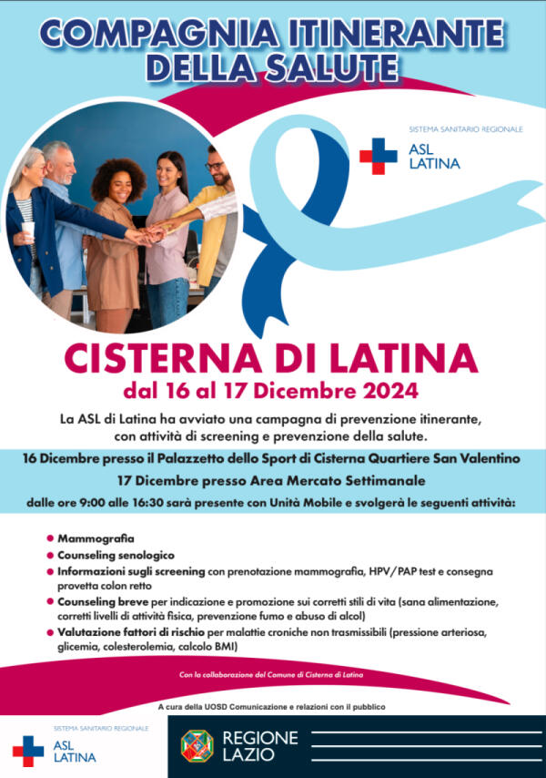 Screening e Prevenzione della Asl di Latina: a Cisterna arriva la “Compagnia itinerante della Salute”.