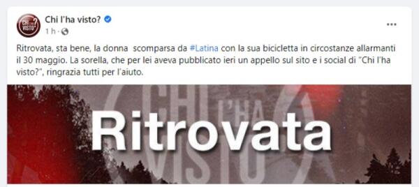 Latina - Ritrovata la donna scomparsa, l'annuncio sulla pagina Facebook di Chi l'ha visto
