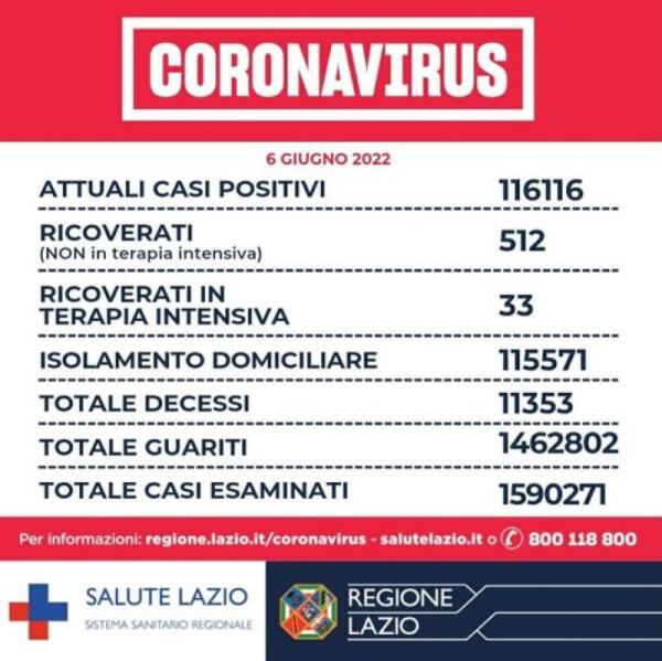Covid Lazio - Sette decessi e 2.844 nuovi contagi