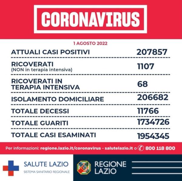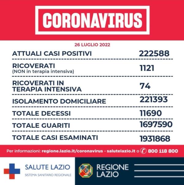 Bollettino Covid Lazio - 22 decessi, 3 nella Asl Roma 6