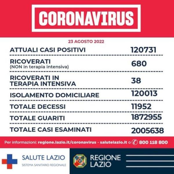 Contagi Covid nel Lazio: ieri 1.698 nuovi casi e 7 decessi.