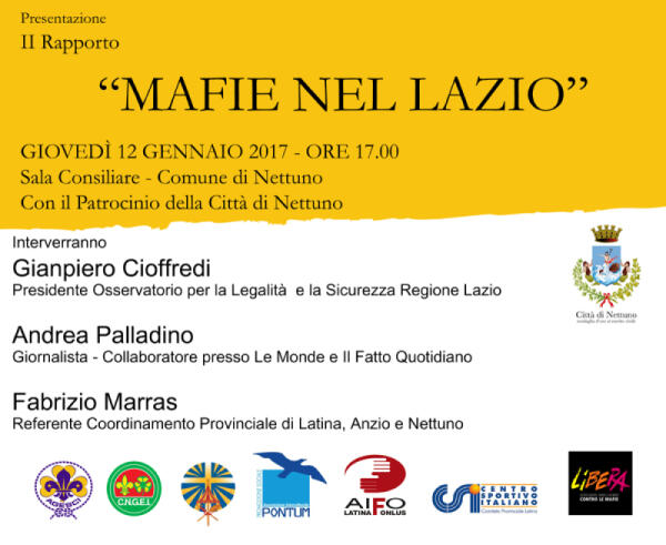 NETTUNO - Il 12 gennaio Libera presenta il secondo “Rapporto Mafie nel Lazio”.