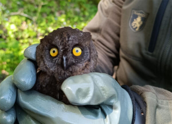 Liberato dalla tubatura di un termocamino, un assiolo torna in libertà a Rocca di Papa grazie ai guardiaparco.